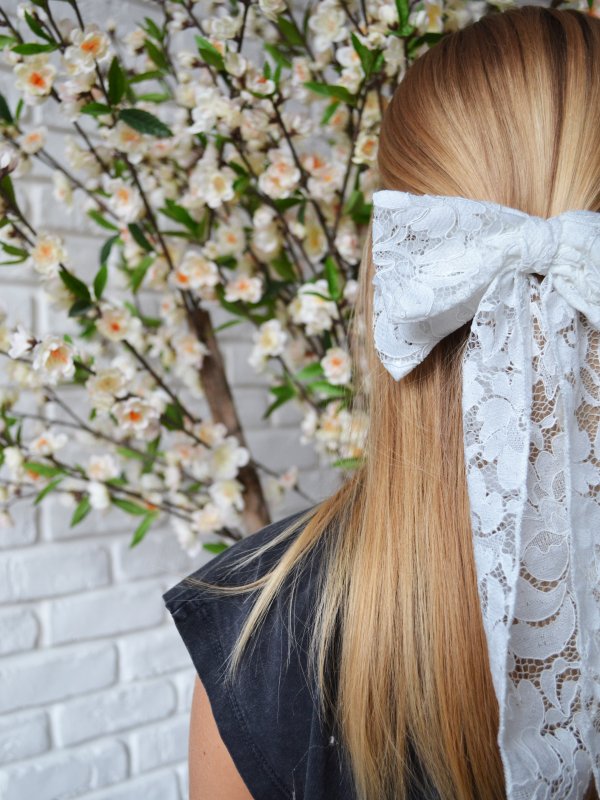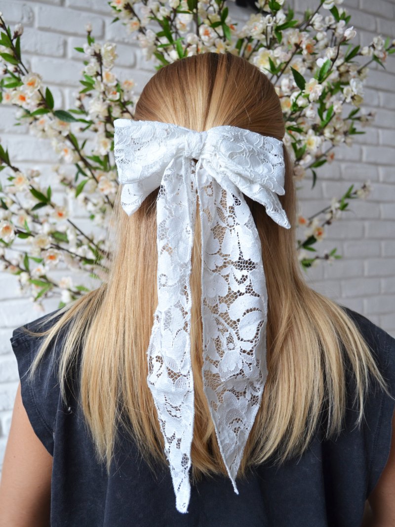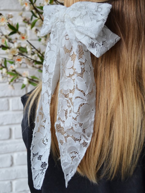 Lazo de encaje blanco con doble lazada y prendedor metálico. Es precioso y con mucha caída!