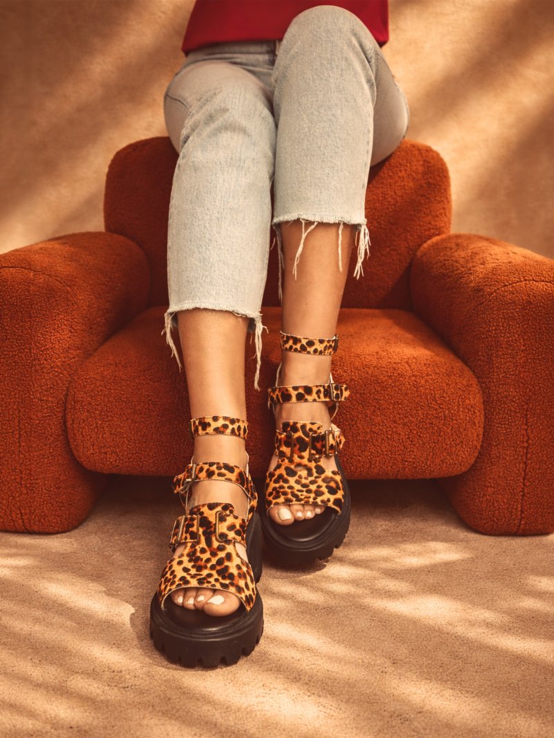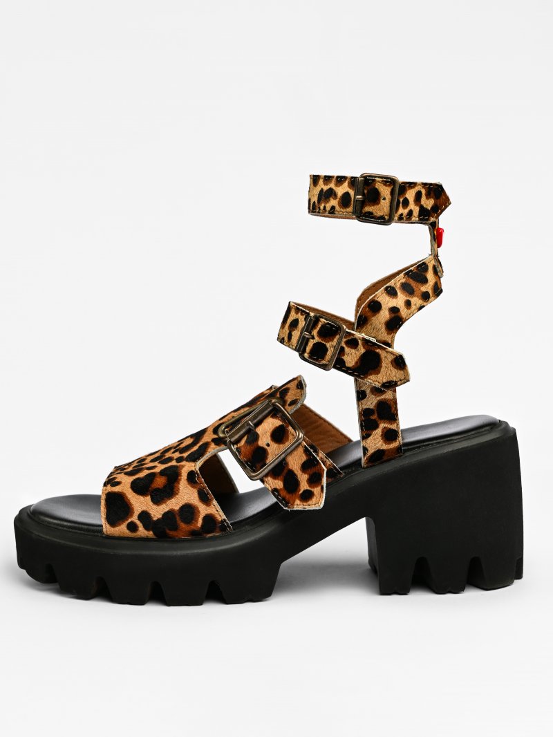 Sandalia de piel de potro con diseño de tiras y hebillas metálicas efecto envejecido, pensada para aportar carácter sin renunciar a la comodidad. Su silueta de plataforma con tacón ancho y piso dentado estiliza visualmente la pierna y aporta estabilidad en la pisada, mientras que el diseño abierto favorece la sujeción y la transpiración, consta de una plantilla extra blanda que amortigua cada paso
