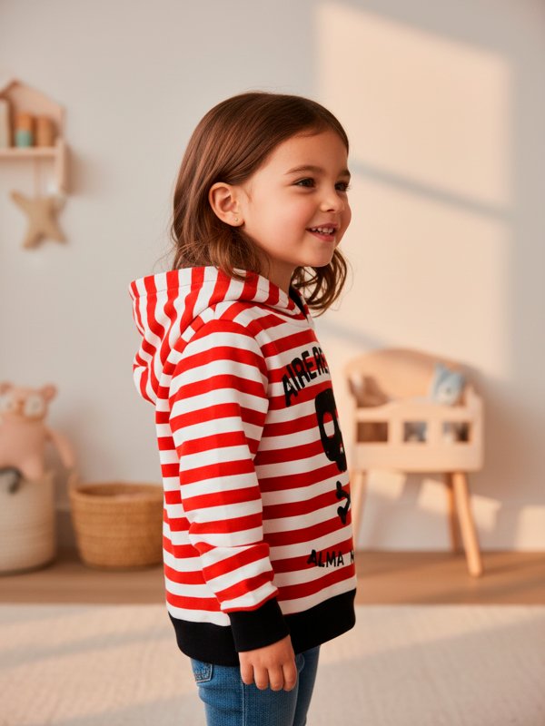 Sudadera Alma Marinera de raya tejida roja y blanca con capucha.