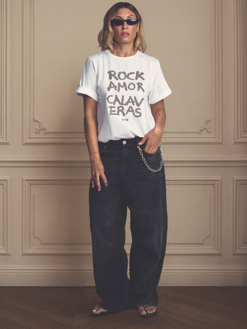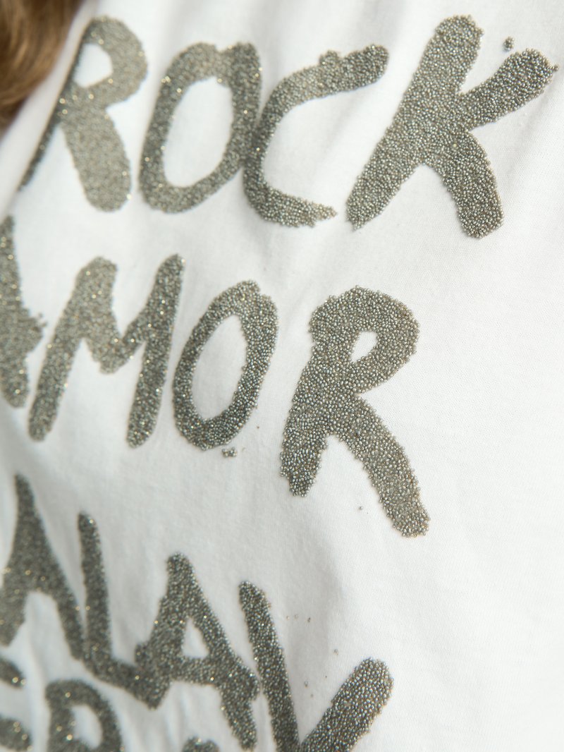 Camiseta básica de algodón relaxed fit con estampado e incrustaciones de bolitas tipo caviar en plata.