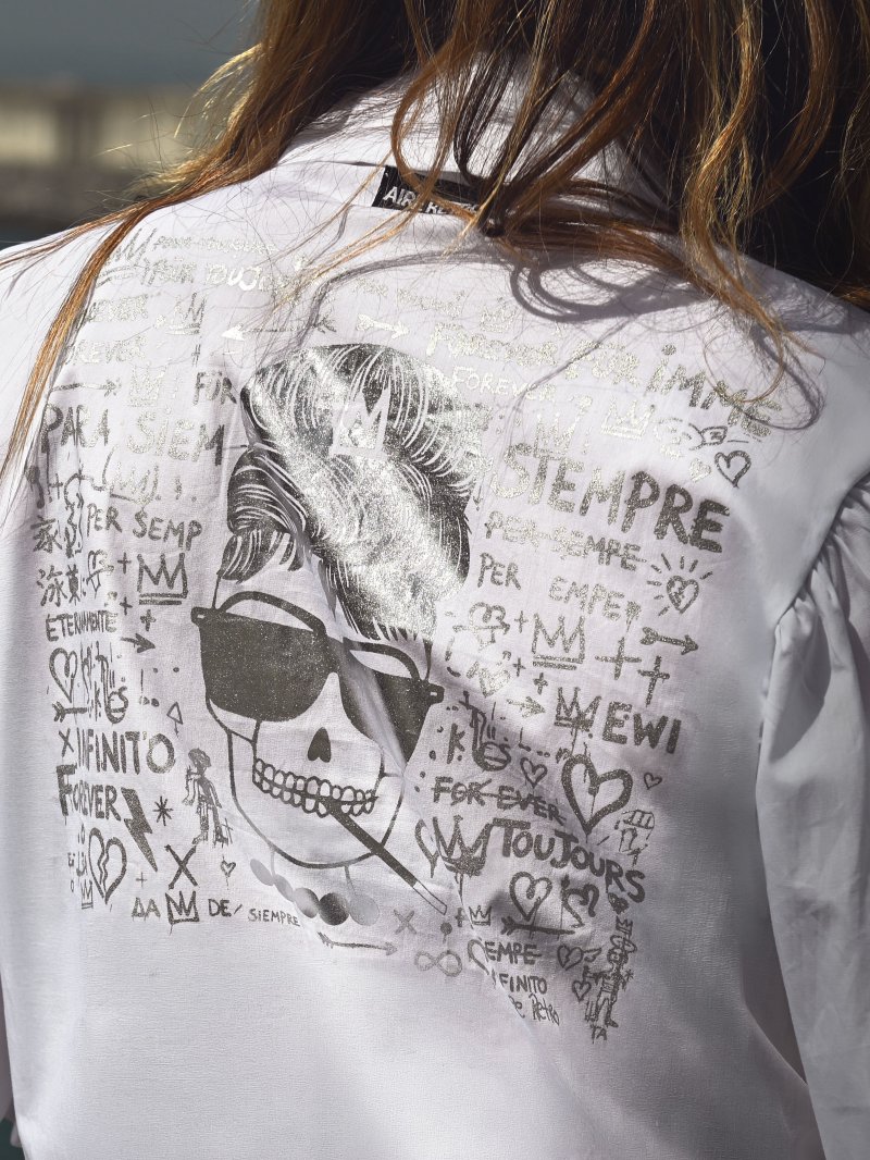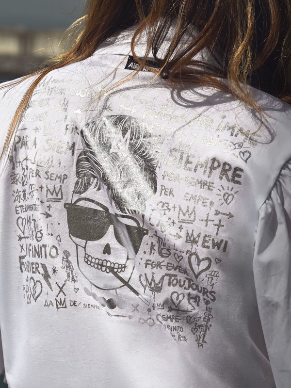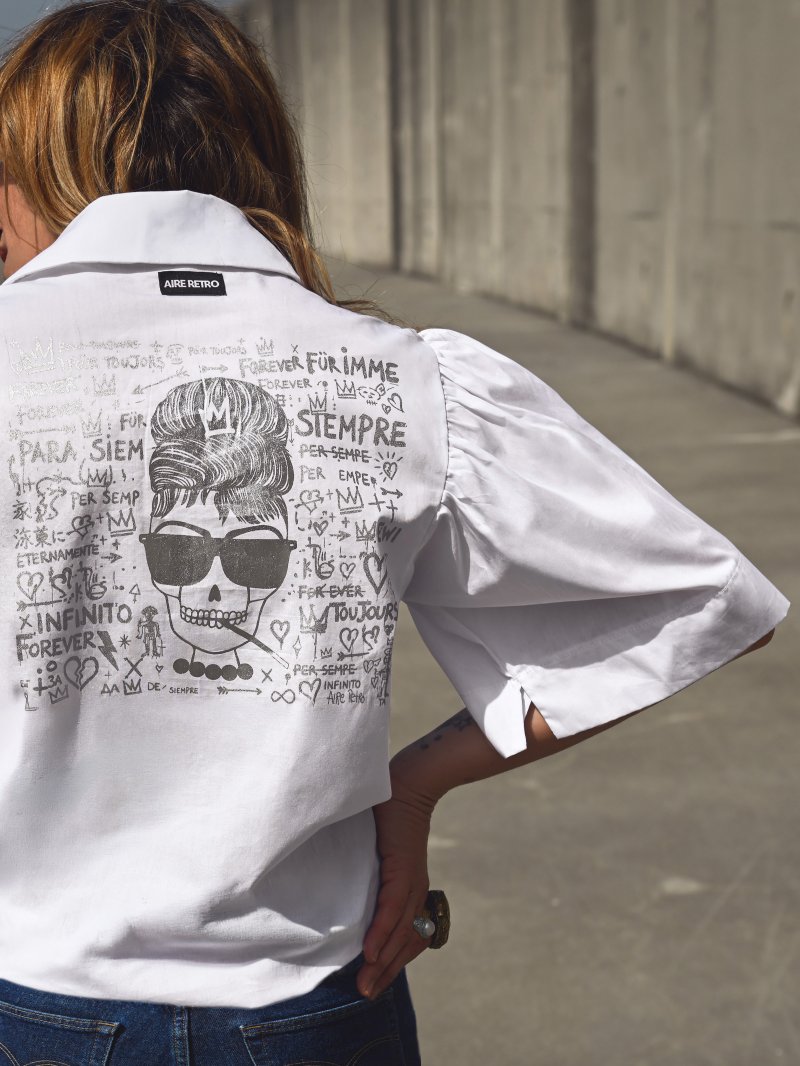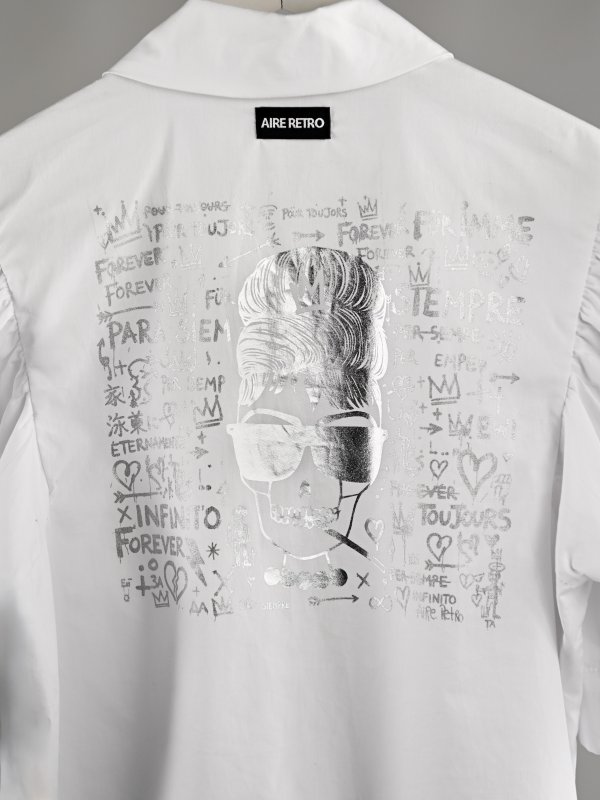 Camisa blanca clásica con manga volumen y estampado en espalda plateado ‘foil’ de Audrey.