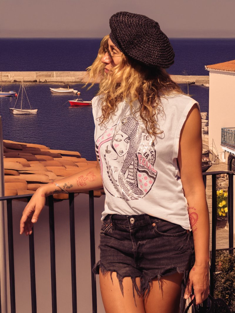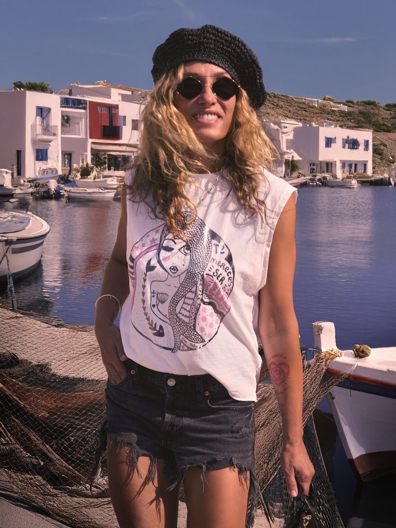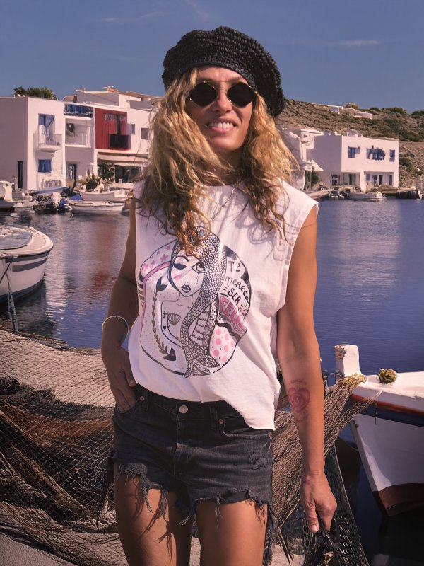 Camiseta blanca sin mangas con estampado foil plata, es Ampliota 100% Algodón de primera calidad muy suavecito.
