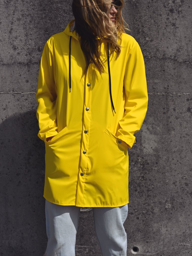 Trench de lluvia (impermeable) negro mate con capucha y serigrafía en espalda. Un clásico con aire retro que no te vas a quitar