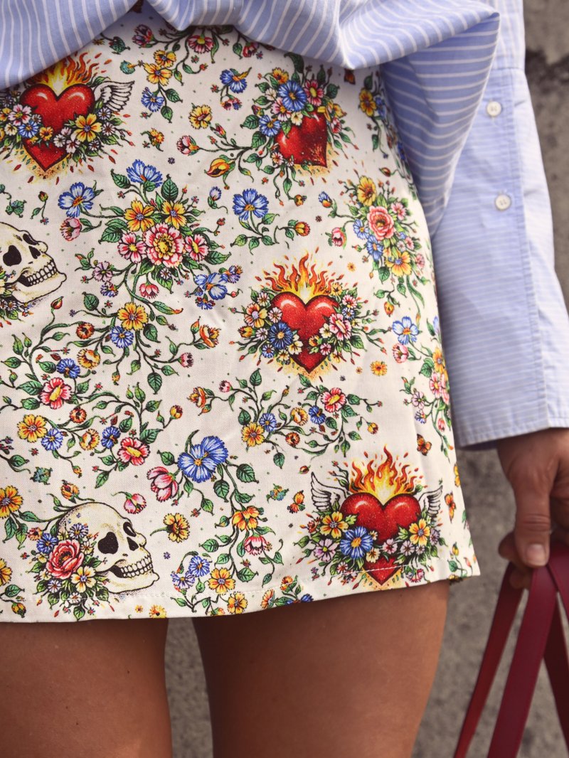 Falda fluida de viscosa y total print muy cañero, es tan fresquita que te prometo que no te quitarás este verano! Con corte evasé y gomita en la parte trasera.