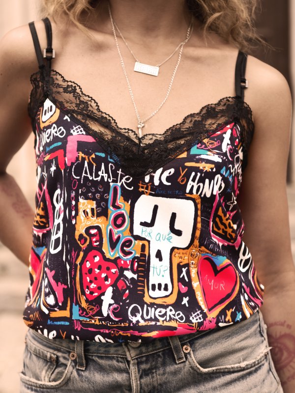 Camiseta de tirante (regulable) con detalle de encaje en pecho y estampado total print Love Pop. Es una camiseta muy especial con mucho rollazo!