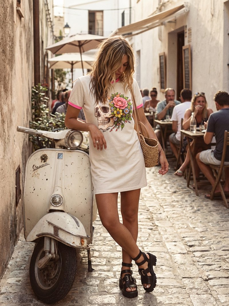 Vestido de algodón beige con vivos en rosa fluorescente, corte evasé y estampado digital a todo color
