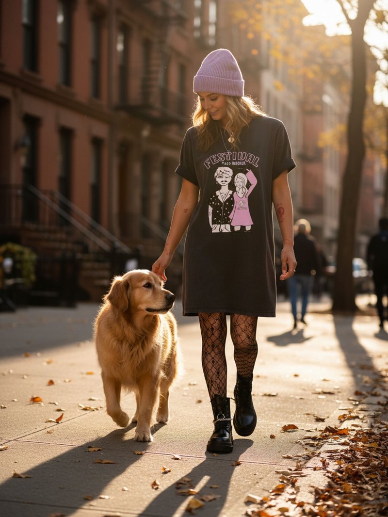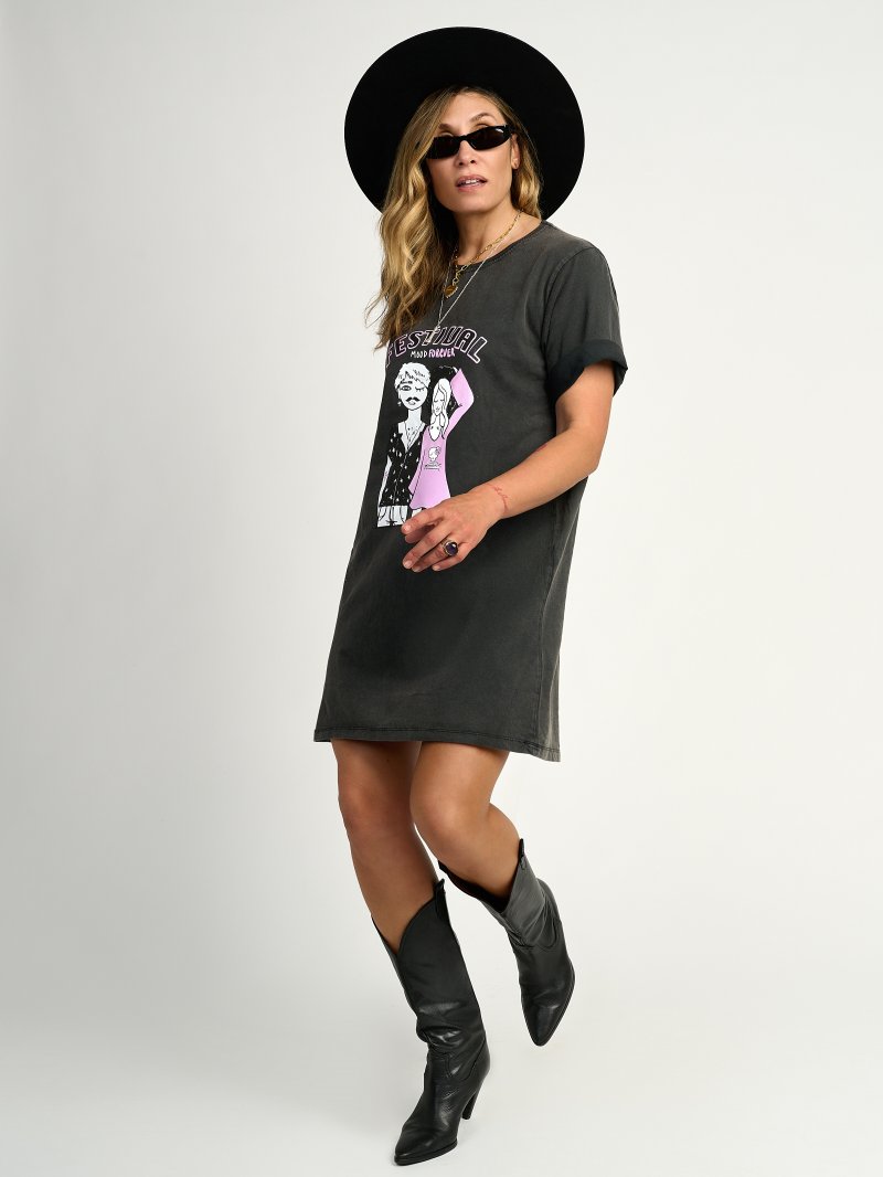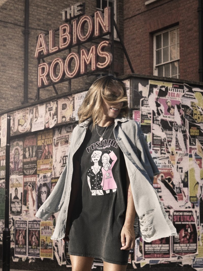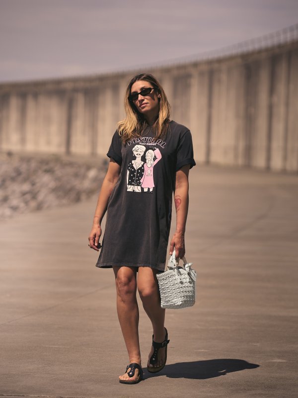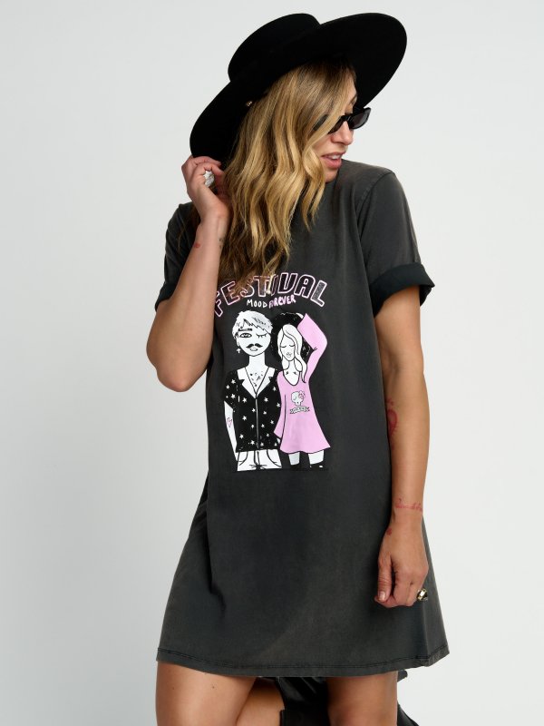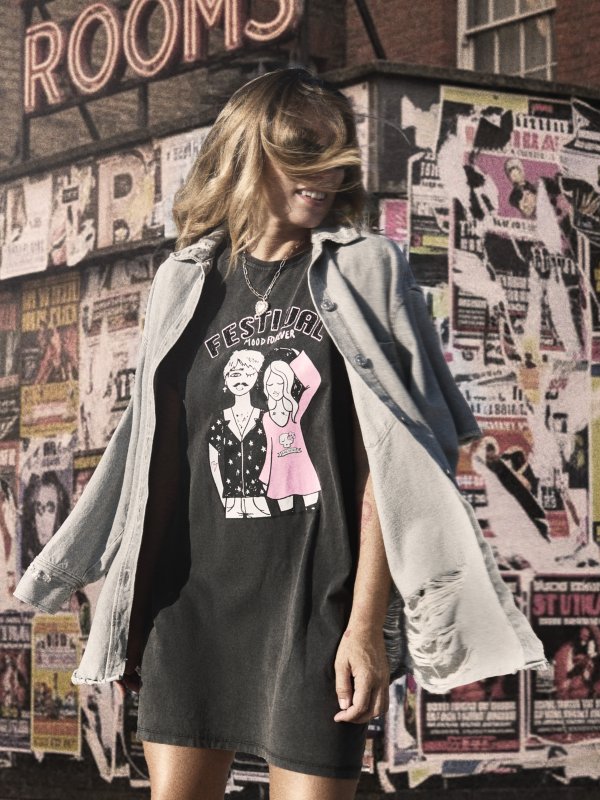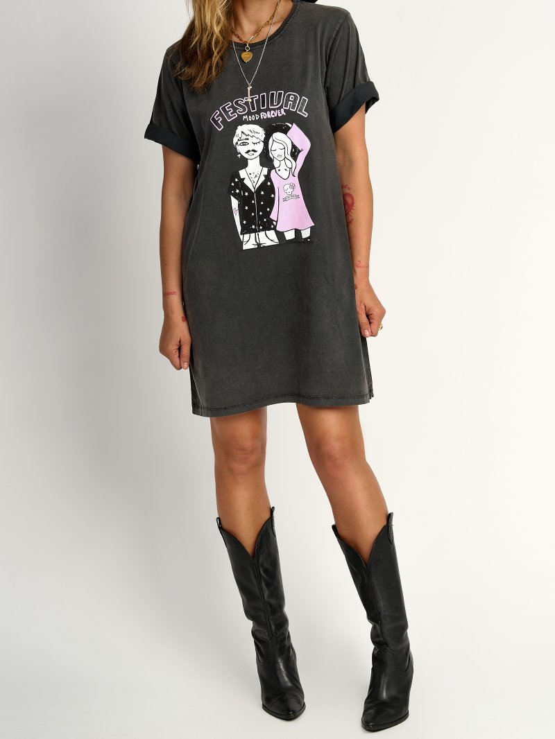 Vestido tipo camiseta 100% algodón de primera calidad con lavado fade out, ilustración "FESTIVAL" con las letras efecto caviar y glitter, porque como ya sabéis no hay nadie que le guste más un festival que a mi jijijij