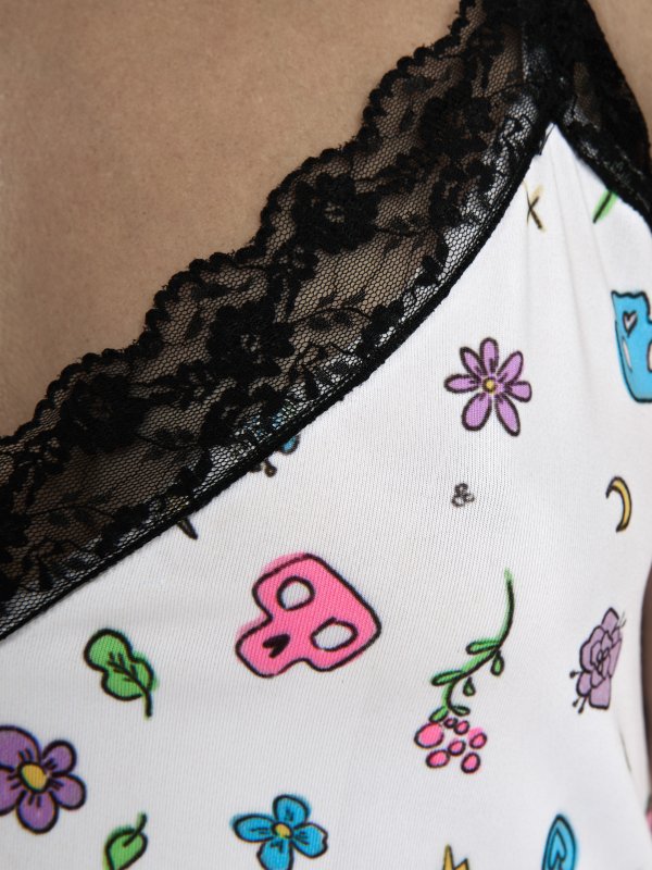 Vestido lencero con encaje en el pecho, tirantes ajustables y estampado total print Dibujitos.