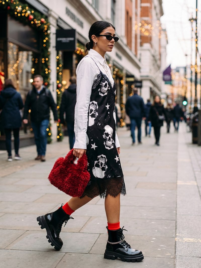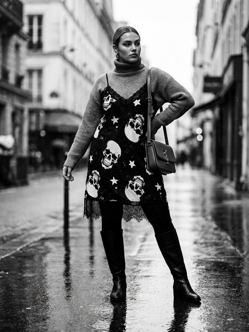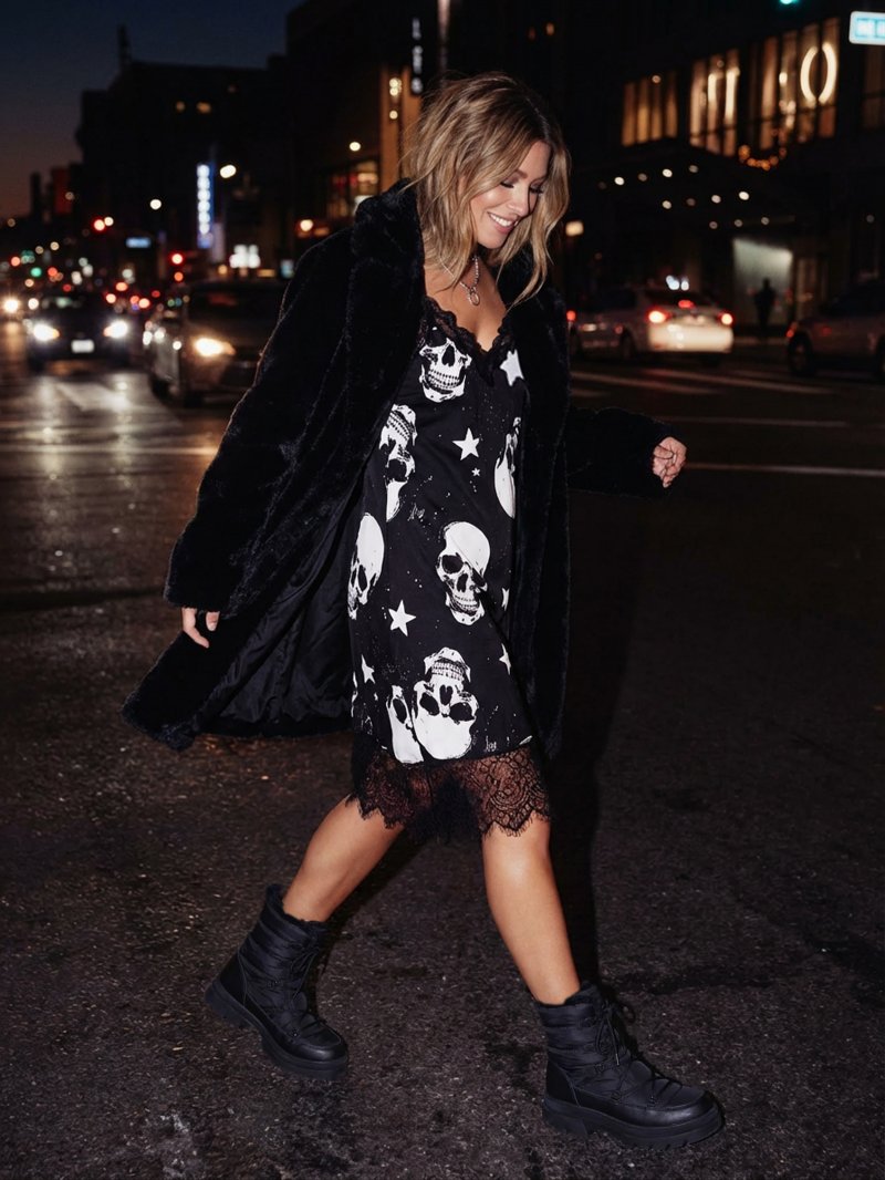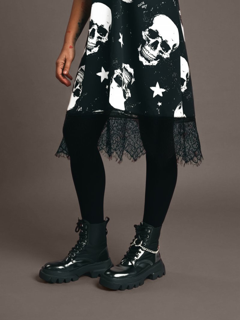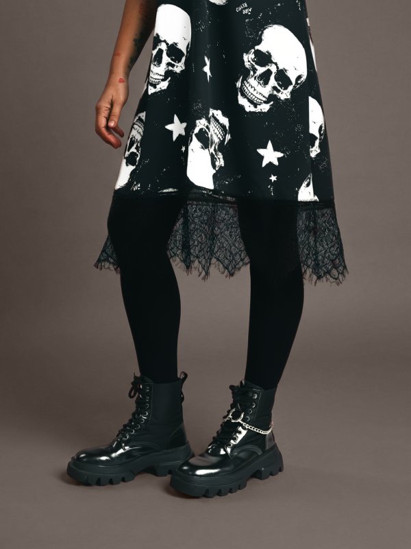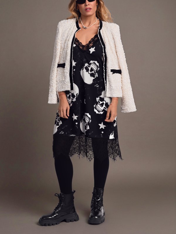 Vestido lencero de tirantes con encaje en pecho y bajo, un diseño sofisticado mezclado con un estampado rock brutal es la auténtica bomba de relojería que necesitas estas navidades, terrible pero sensible como tú!