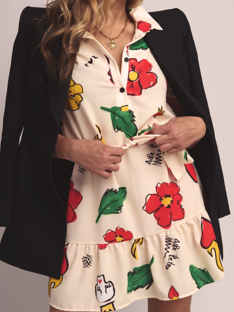 Vestido camisero con abotonadura en el pecho y volante en el bajo. Tiene cinturón a juego